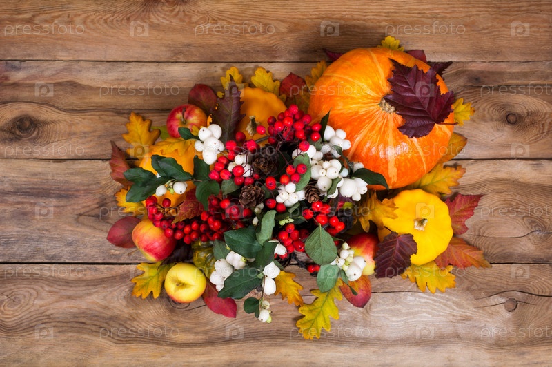 Центральная часть Дня благодарения со снежной ягодой и тыквами на деревянном фоне