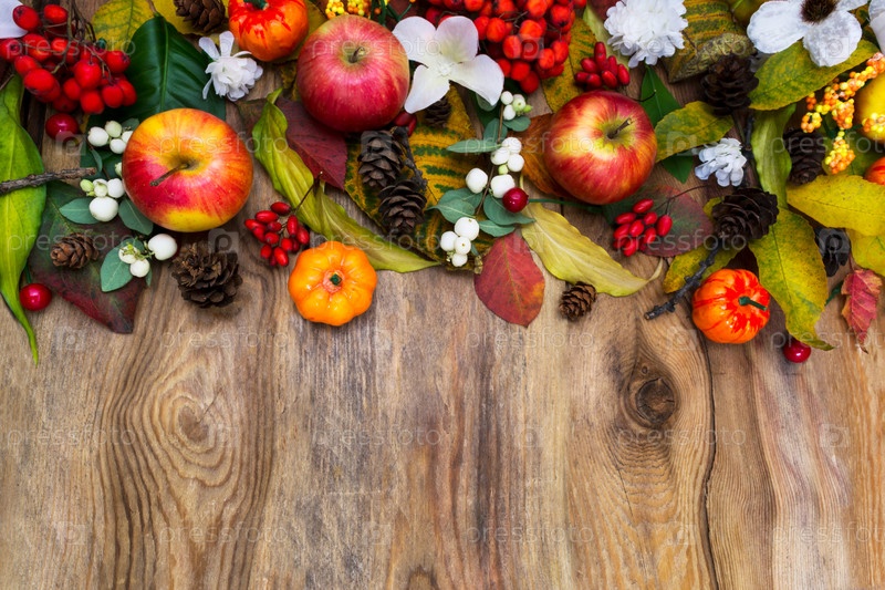 Композиция на День благодарения с тыквами, яблоками, листьями, ягодами рябины и белыми цветами