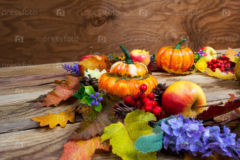 Фон благодарения с листьями, спелыми оранжевыми тыквами, сиреневыми цветами