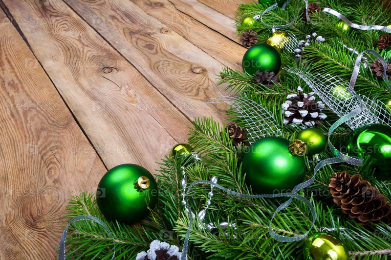 Рождественская гирлянда с зелеными безделушками на деревенском деревянном фоне, пространство для копирования