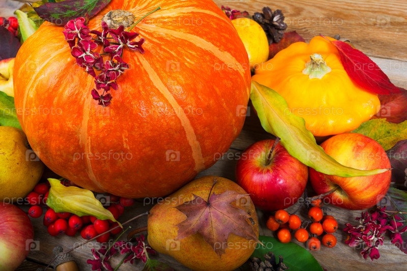 Осенний фон с оранжевой тыквой, желтой тыквой, грушей