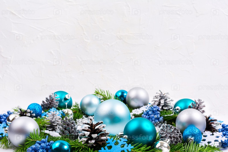 Рождественские серебряные, бледно-голубые, бирюзовые шары, фон с блестящими ягодами, пространство