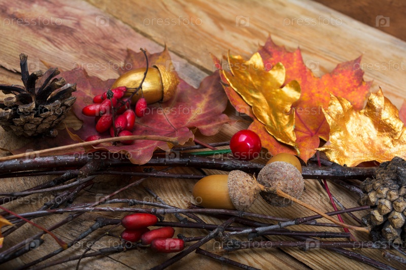Фон благодарения с желудями, золотыми и красочными кленовыми листьями