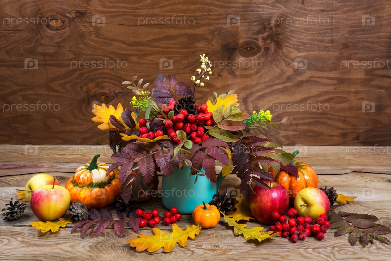 Центральная часть благодарения с рябиной в бирюзовой вазе, место для текста