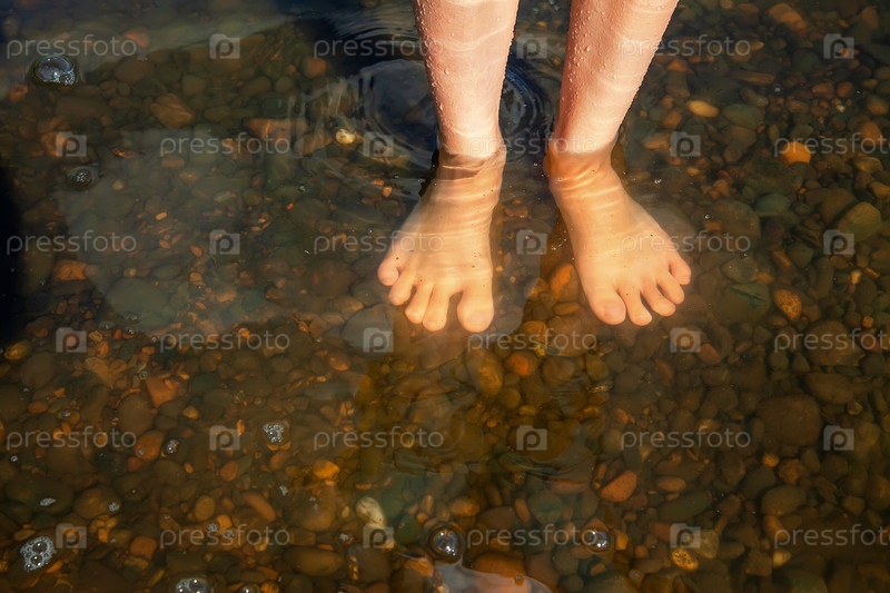 Летний туризм и путешествия. ноги подростка стоят в воде в реке. мелкие камни в воде