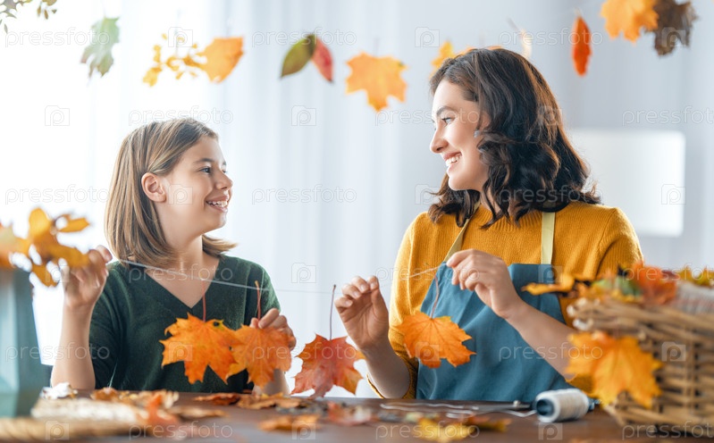 Семья делает осенний декор