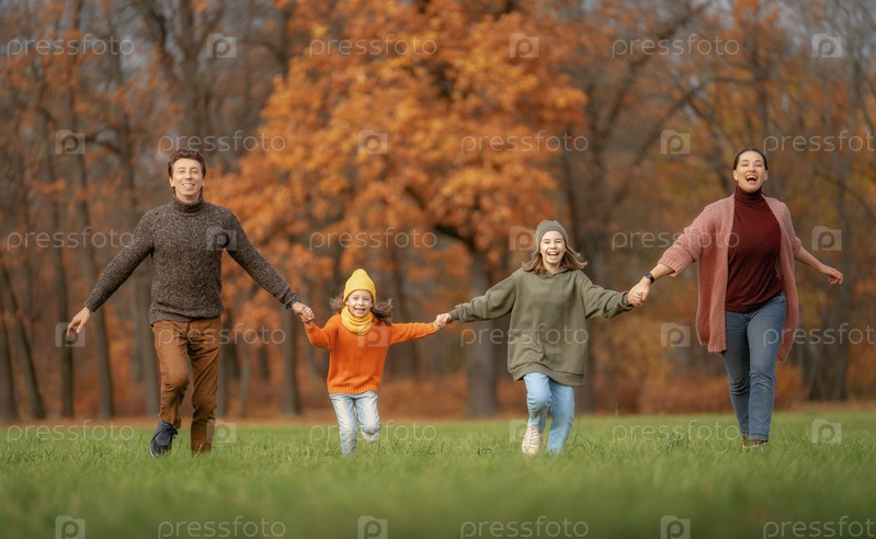 Счастливая семья на осенней прогулке