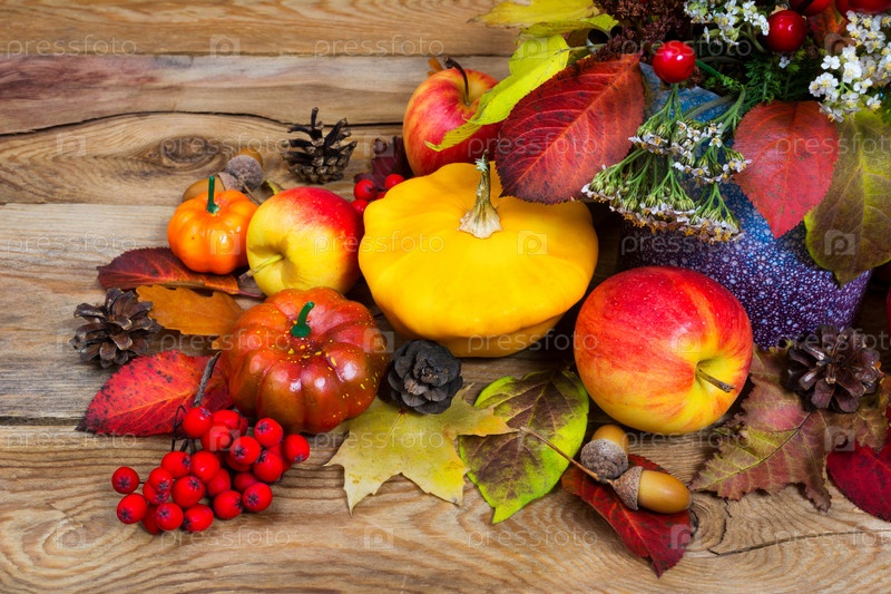 Осенняя композиция с фиолетовой вазой, желтой тыквой, яблоками
