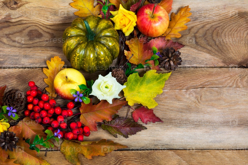 Тыква на День благодарения, яблоко, сиреневые цветы и рябиновый венок, пространство для копирования