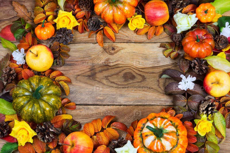 Граница тыкв, яблок, сосновых шишек, осенних листьев, желтых роз