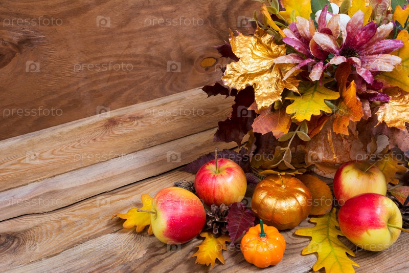 Украшение на День благодарения с золотой тыквой и осенними листьями