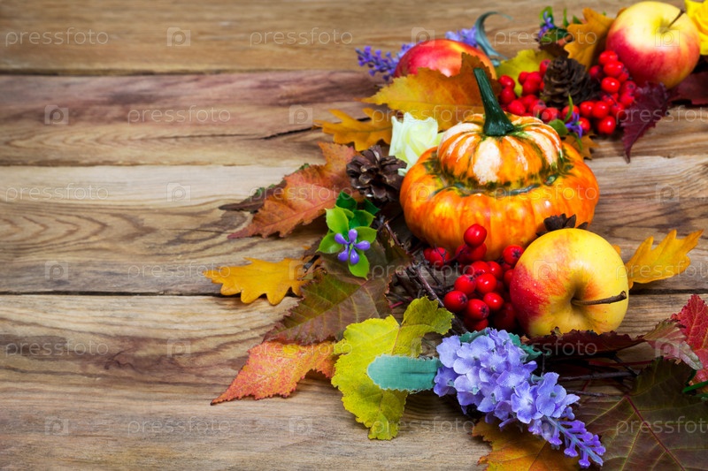 Осенняя тыква, разноцветные листья, дверной венок из сиреневых цветов, пространство для копирования
