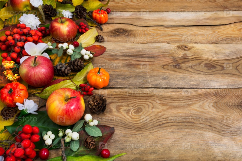 Осеннее приветствие с тыквами, красными и белыми ягодами, пространство для копирования