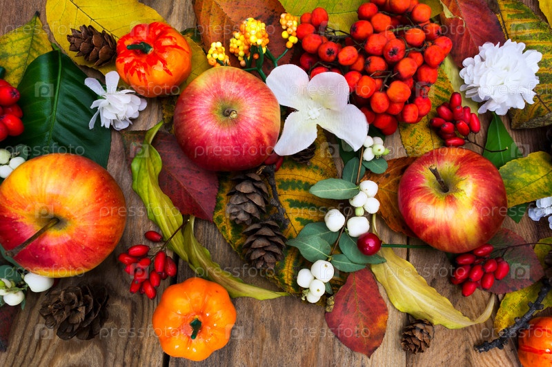 Осеннее украшение со спелыми яблоками, тыквами и белыми шелковыми цветами, вид сверху