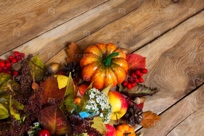 Осенние тыквы и яблоки на старом деревянном столе