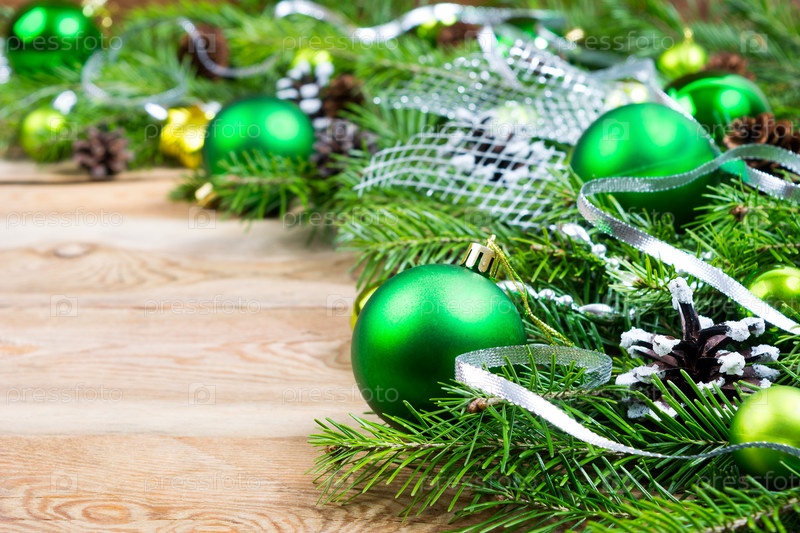 Рождественский фон с зелеными безделушками и серебряной лентой