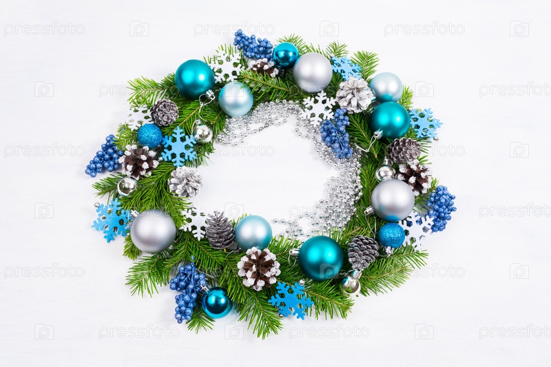 Рождественские серебряные, синие, бирюзовые шары и венок из сосновых шишек