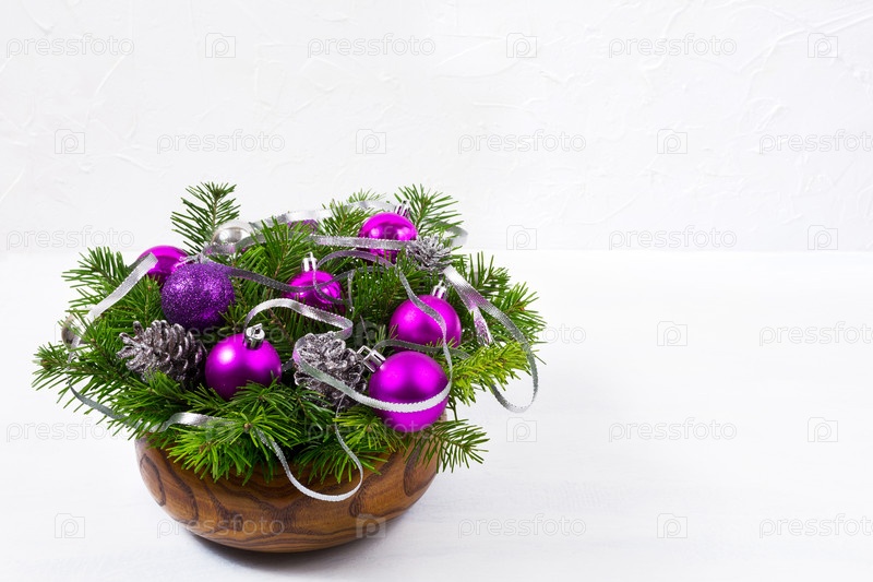 Рождественская центральная часть с блестками и фиолетовыми безделушками, пространство для копирования