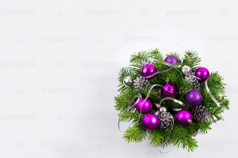 Рождественский венок с серебряной лентой и фиолетовыми безделушками, пространство для копирования