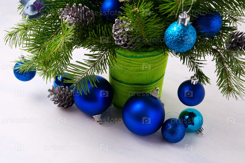 Рождественский центральный элемент с голубыми украшениями и еловыми ветками в зеленой вазе
