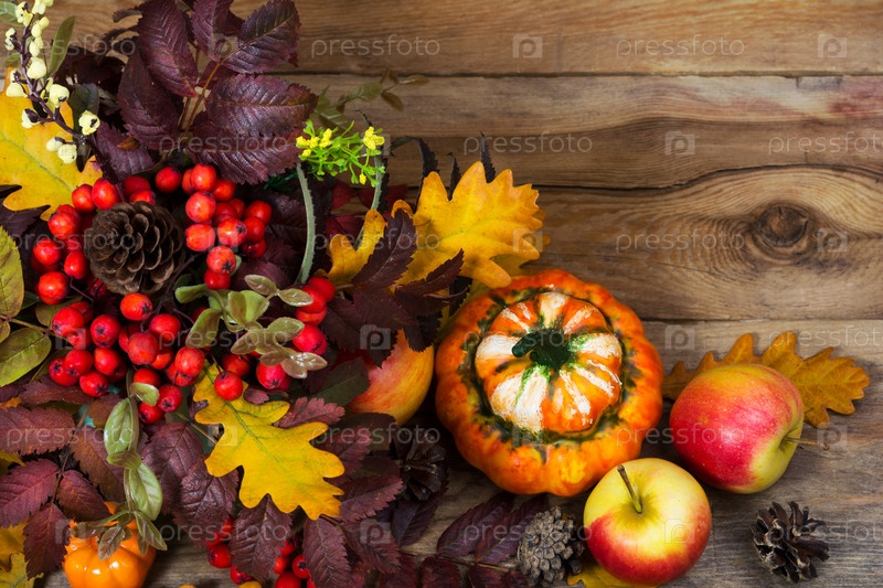 Фон благодарения с рябиной и дубовыми листьями на деревянном столе, пространство для копирования