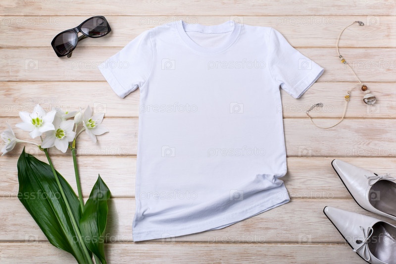 Женский макет белой футболки с цветами лилии, зелеными листьями