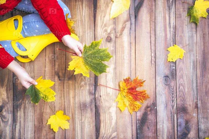 Ребенок играет с осенними листьями