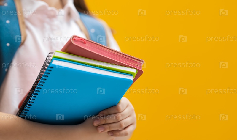 Ребенок с книгами на фоне желтой стены