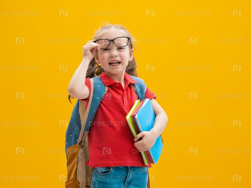 Малыш с рюкзаком на цветном фоне
