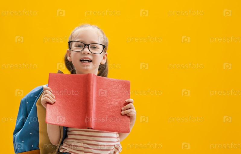 Малыш с рюкзаком на цветном фоне