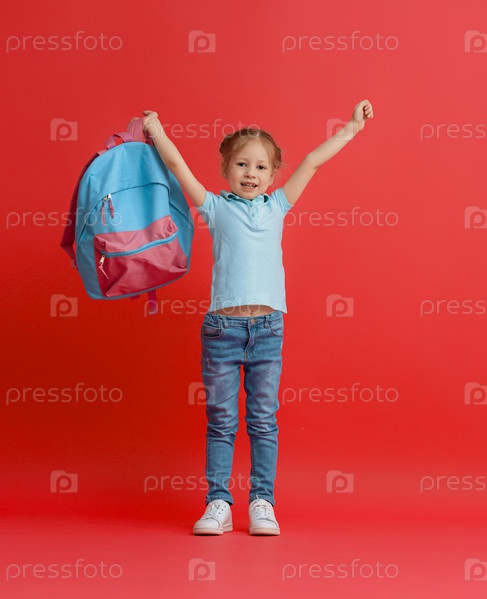 Малыш с рюкзаком на цветном фоне
