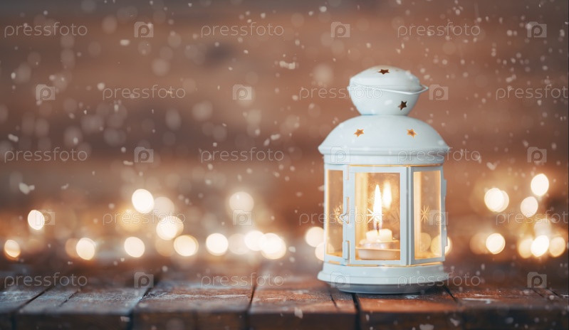 Фонарь со свечой на деревянном фоне