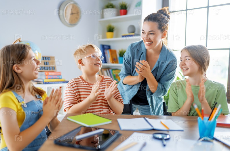 Счастливые дети и учитель в школе