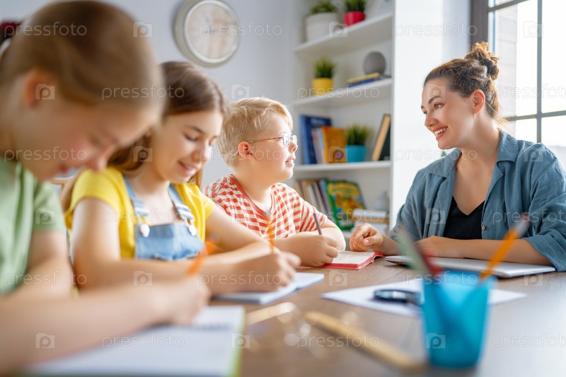Счастливые дети и учитель в школе