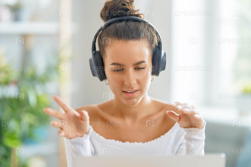 Женщина работает на ноутбуке дома