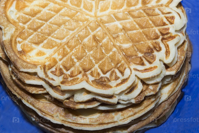 Стопка блинов, приготовленных в вафельнице. Еда на национальный праздник Масленица. Готовая еда на завтрак