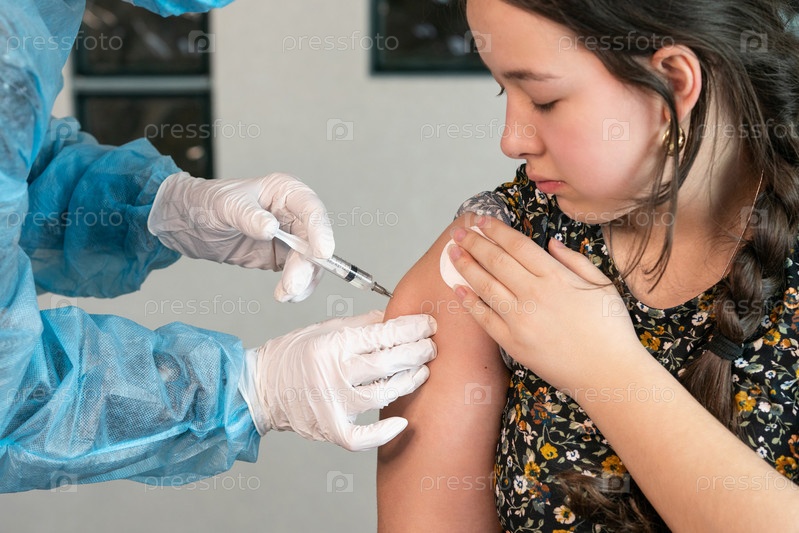 Девушке вводят вакцину в плечо. Прививка от коронавируса. Вакцинация старого пациента в клинике с копировальным пространством. Врач делает укол девушке в больнице