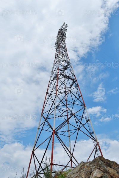 Металлический пилон высокого напряжения на фоне голубого облачного неба