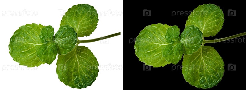 Веточка с листьями мяты с каплями, выделенными на белом и черном фоне