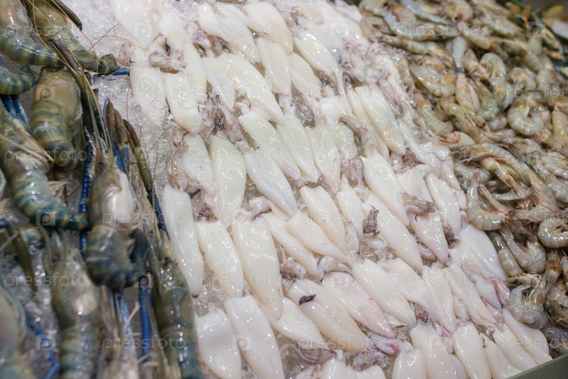Свежий кальмар на рынке для продажи. Морепродукты из белых сырых кальмаров