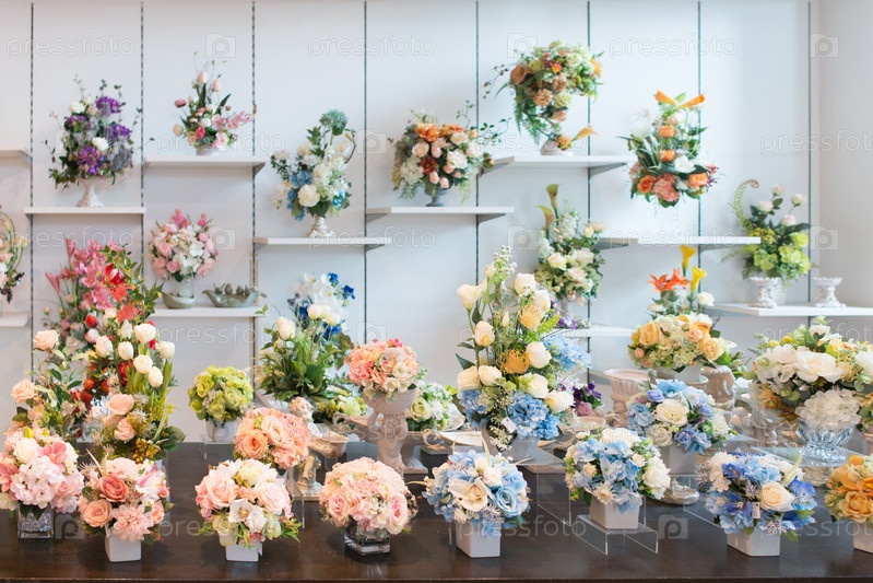 Декоративные букеты ярких цветов на витрине магазина