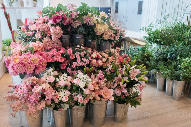 Многие цветы и букеты стоят в цветочном магазине