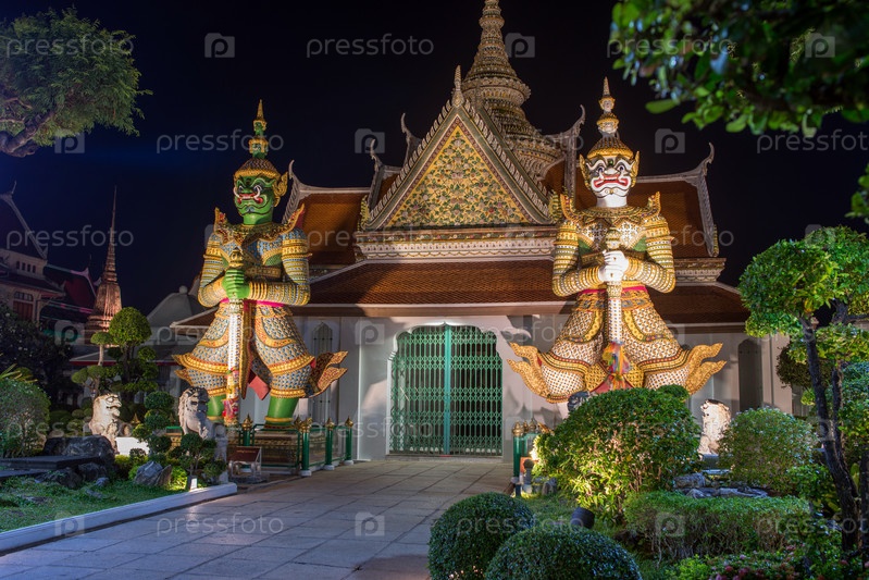 Буддийский храм Ват Арун Храм Рассвета со стражами, защищающими ворота. Бангкок, Тайланд