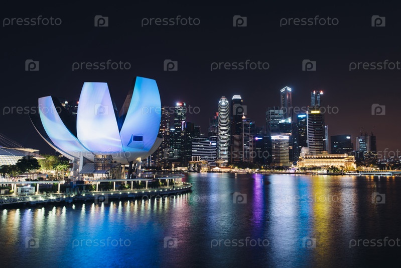 СИНГАПУР - 24 февраля 2019 г.: Городской пейзаж в центре города. Ночной городской пейзаж Сингапура