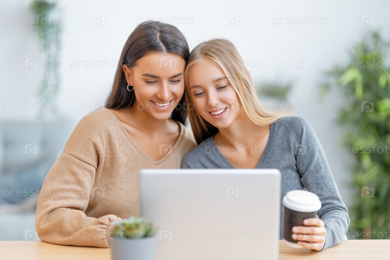 Две счастливые молодые женщины с ноутбуком