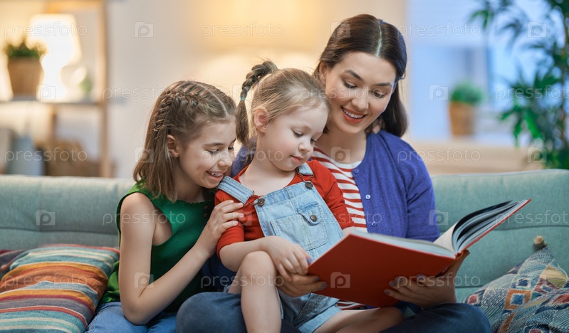 Мама читает книгу дочерям