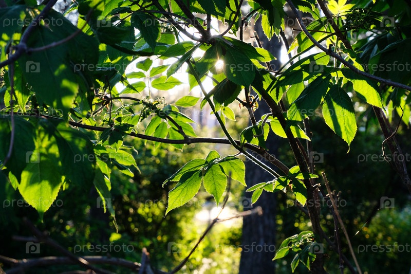 Летняя зеленая листва деревьев в подсветке заходящего солнца. Красивый естественный фон