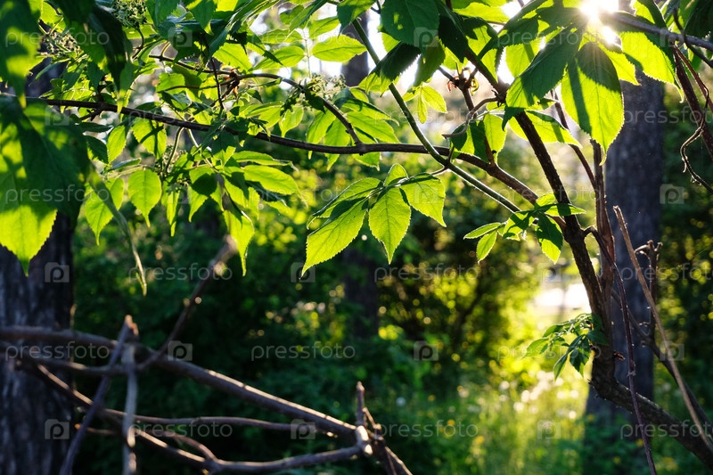 Летняя зеленая листва деревьев в подсветке заходящего солнца. Красивый естественный фон