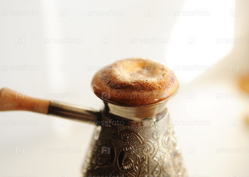 Заваривание турецкого кофе в медной турке. Поднимающаяся пена крупным планом. белый фон
