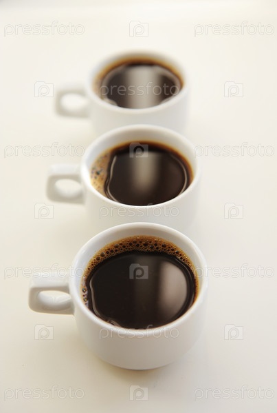 Черный кофе в белых чашках один за другим на белом фоне